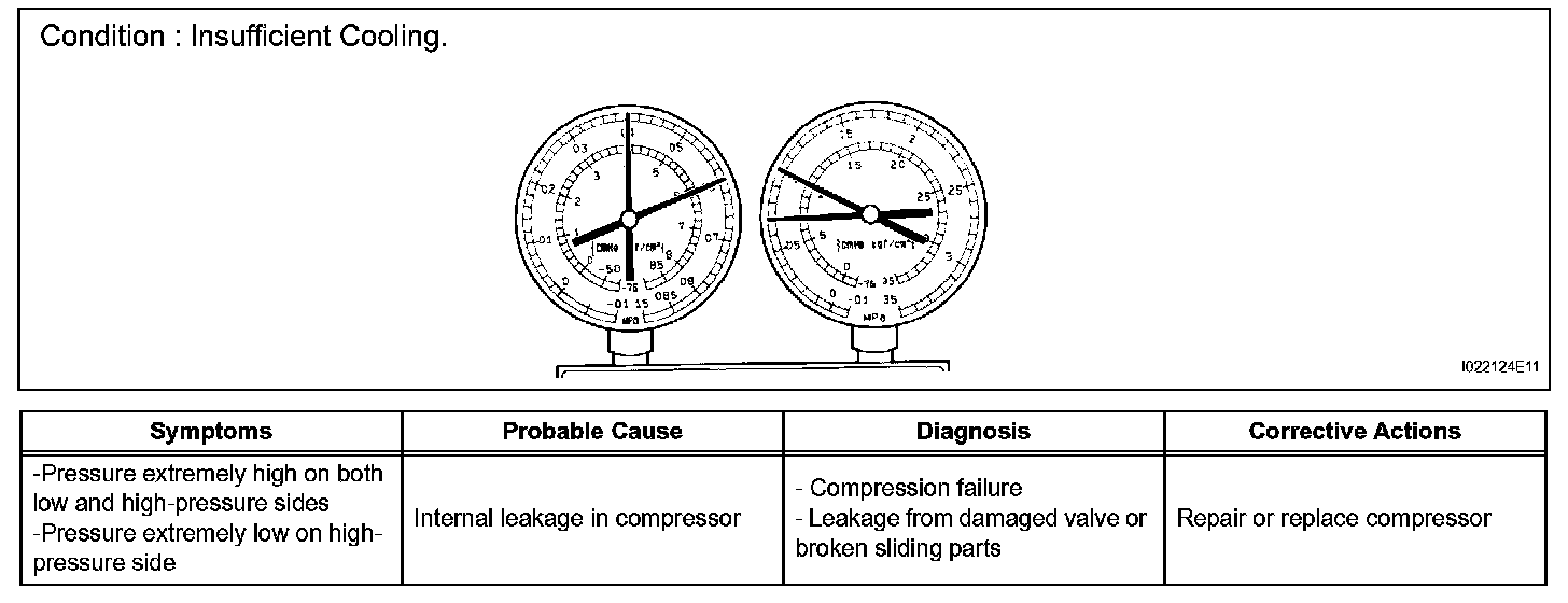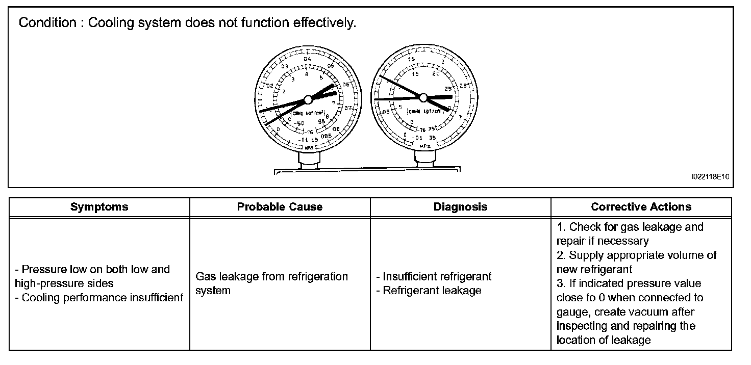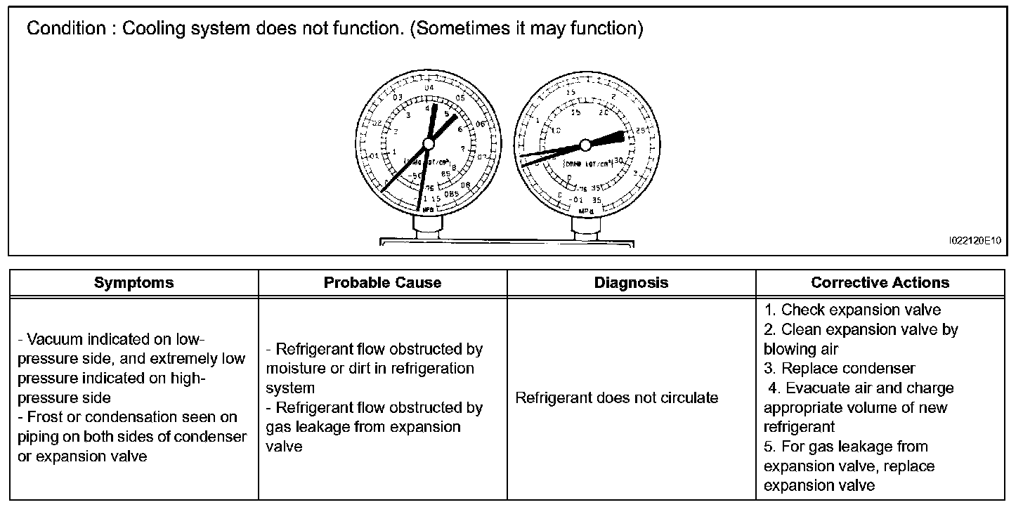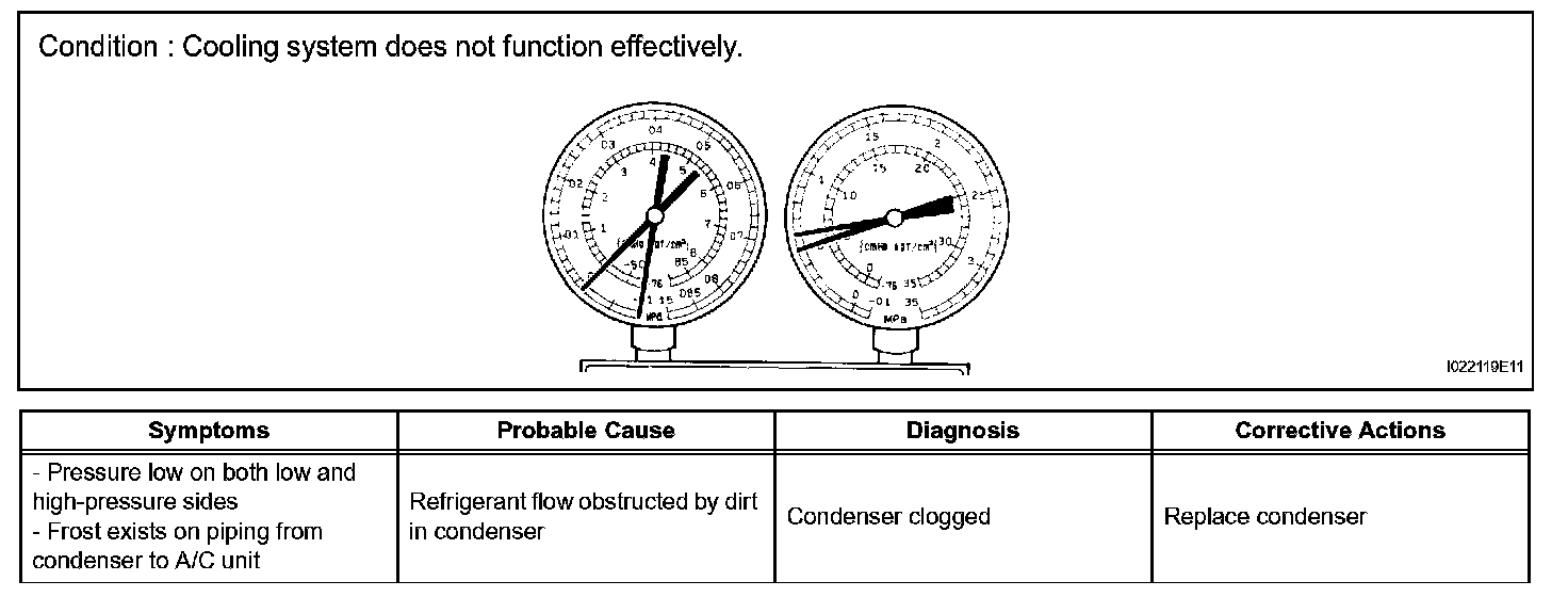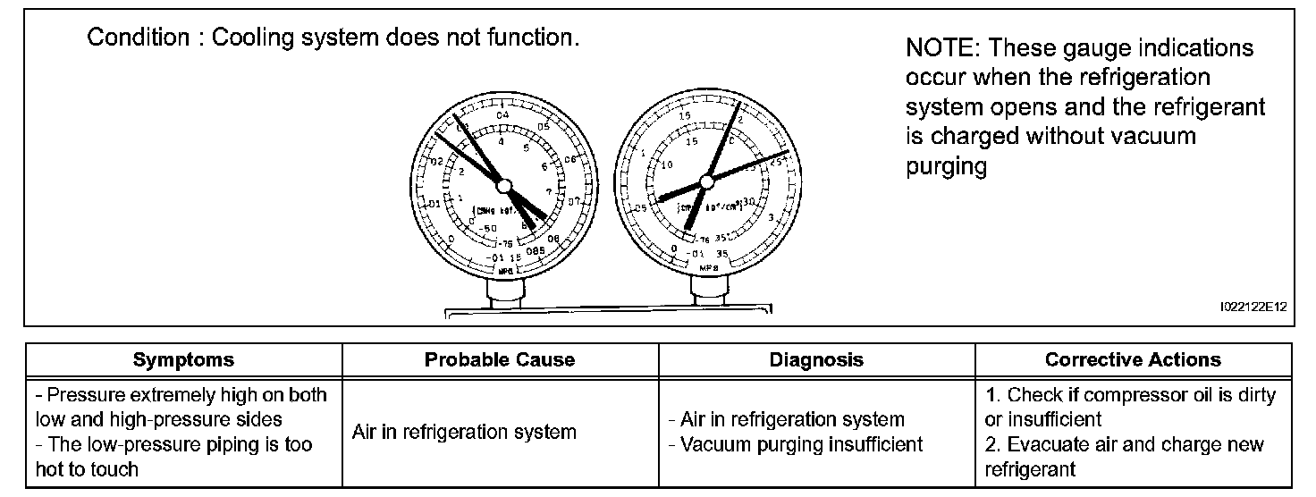 7. The A/C system does not function due to air in the refrigeration system.
