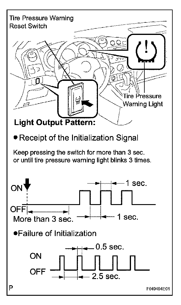 HINT: If the tire pressure warning light repeats a cycle of ON (0.5 seconds) and OFF (2.5 seconds) while the vehicle is being driven, initialization may have failed.
