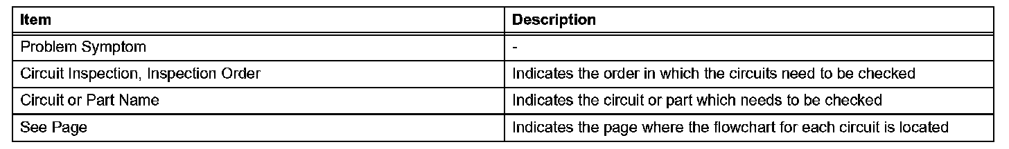 PROBLEM SYMPTOMS TABLEWhen a "Normal" code is output during a DTC check but the problem still occurs, use the Problem Symptoms Table. The suspected areas (circuits or parts) for each problem symptoms are in the table. The suspected areas are listed in order of probability. A description of each of the chart's columns is shown in the table.