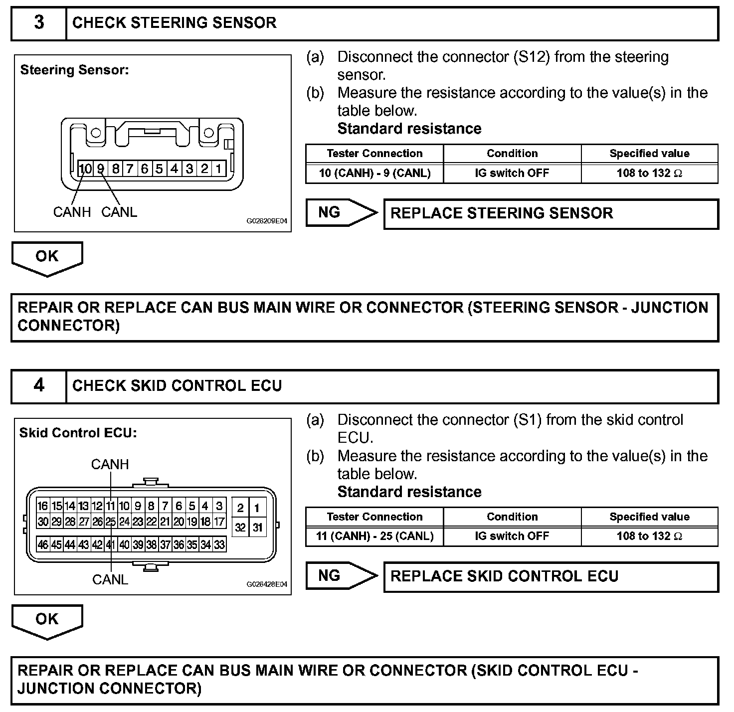 The CAN main bus line and DLC3 sub bus line may have a disconnection when the resistance between terminals 6 (CANH) and 14 (CANL) of the DLC3 is more than 69 ohms.