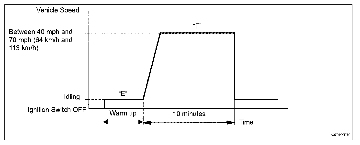 6. Drive the vehicle at between 40 mph and 70 mph (64 km/h and 113 km/h) for at least 10 minutes (Procedure "F").