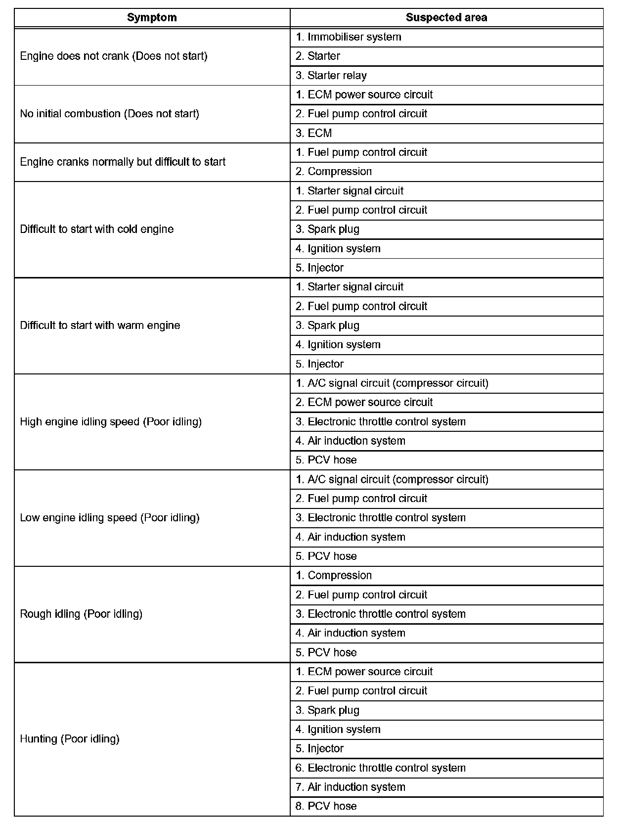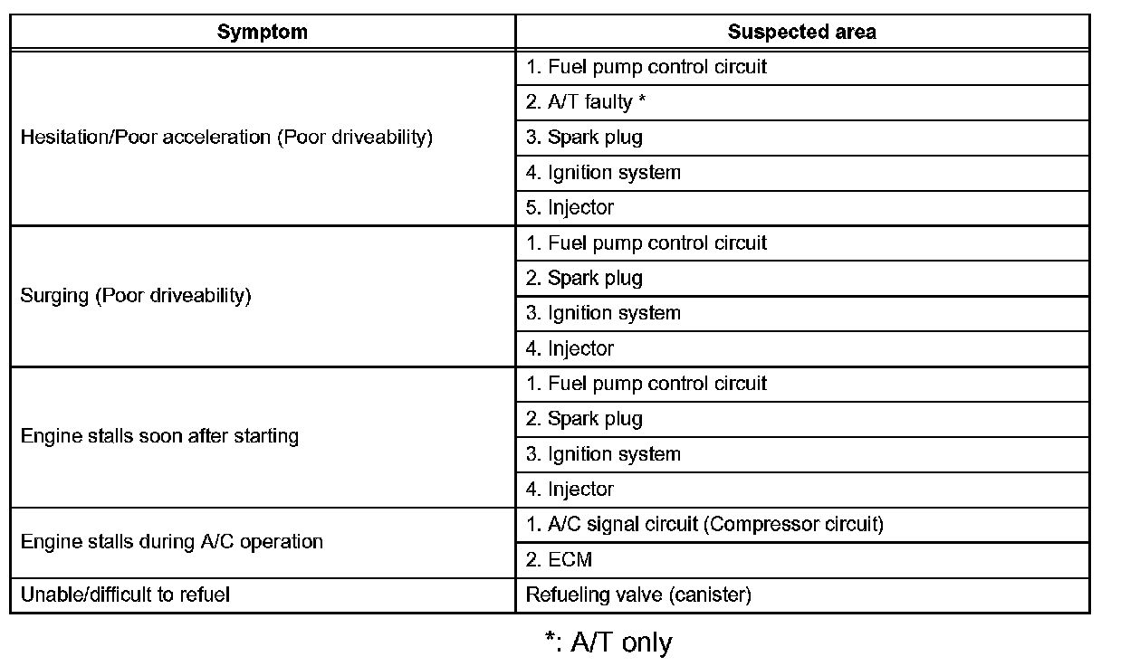 HINT: When a malfunction is not confirmed by a DTC (Diagnostic Trouble Code) check and the cause of problem cannot be identified through a basic inspection, troubleshoot according to the priority order indicated in the table.