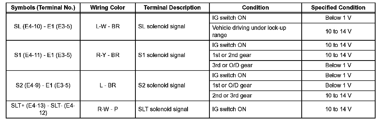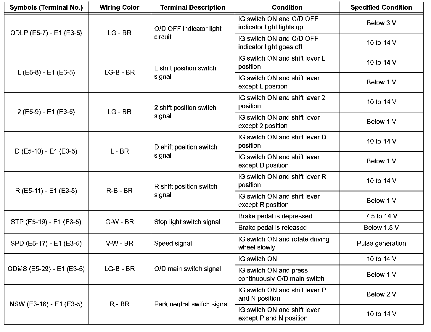 In the table, first follow the information under "Condition". Look under "Symbols (Terminal No.)" for the terminals to inspected. The standard voltage between the terminals is shown under "Specific Condition".