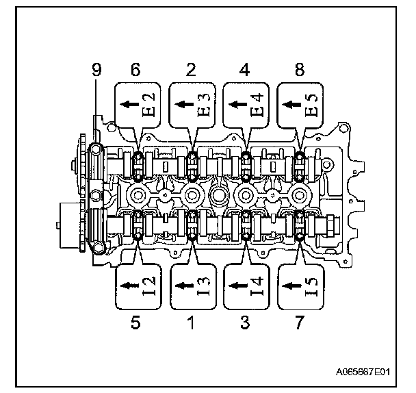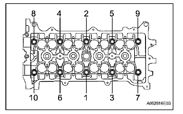Cylinder HeadUsing several steps, uniformly install and tighten the 10 cylinder head bolts and plate washers with a bi-hexagon wrench 10 mm min the sequence shown in the illustration.