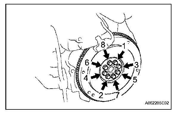 FlywheelUsing several steps, uniformly install and tighten the 8 bolts in the sequence shown in the illustration (Procedure "A").