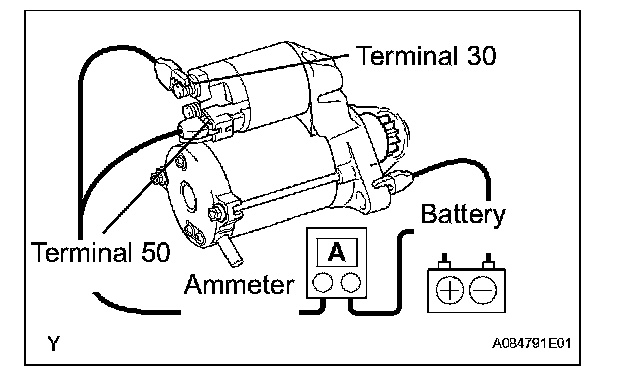 3. Connect the battery and an ammeter to the starter as shown in the illustration.
