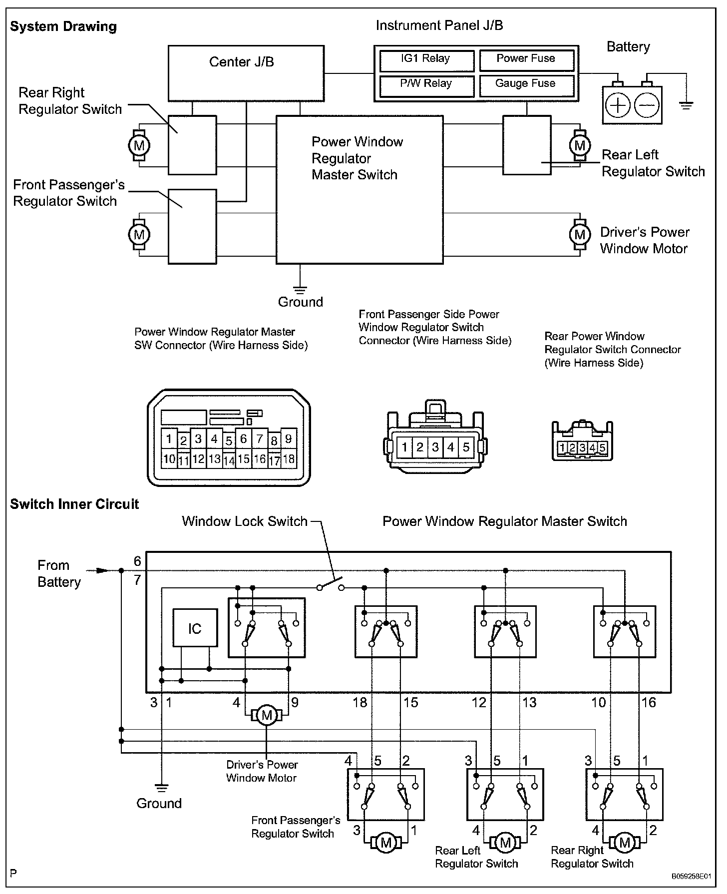 When the ignition SW is turned on, the current flows through the GAUGE fuse to TERMINAL 1 of the P/W relay to TERMINAL 2 to GROUND. This activates the relay and the current flows through the POWER fuse to TERMINAL 5 of the relay to TERMINAL 3 to TERMINAL B of the power window master SW, TERMINAL 4 of the power window control SW front RH and TERMINAL 3 of the power window control SW rear LH, RH.