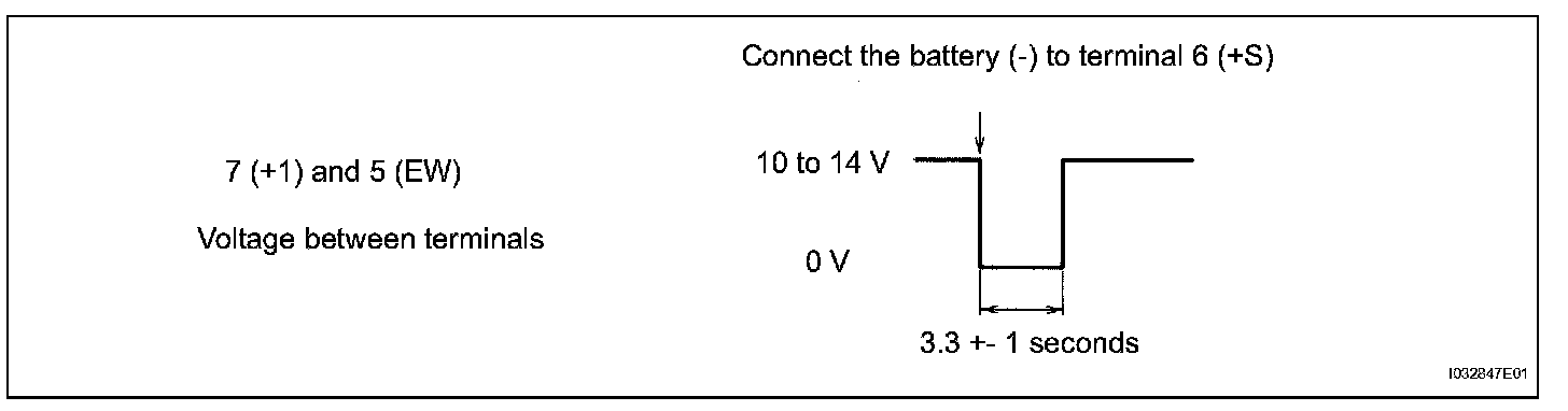 5. Connect the battery (-) to terminal 6 (+S) of the connector. Operate the intermittent wiper relay and check voltage between terminal 7 (+1) and terminal 5 (EW).