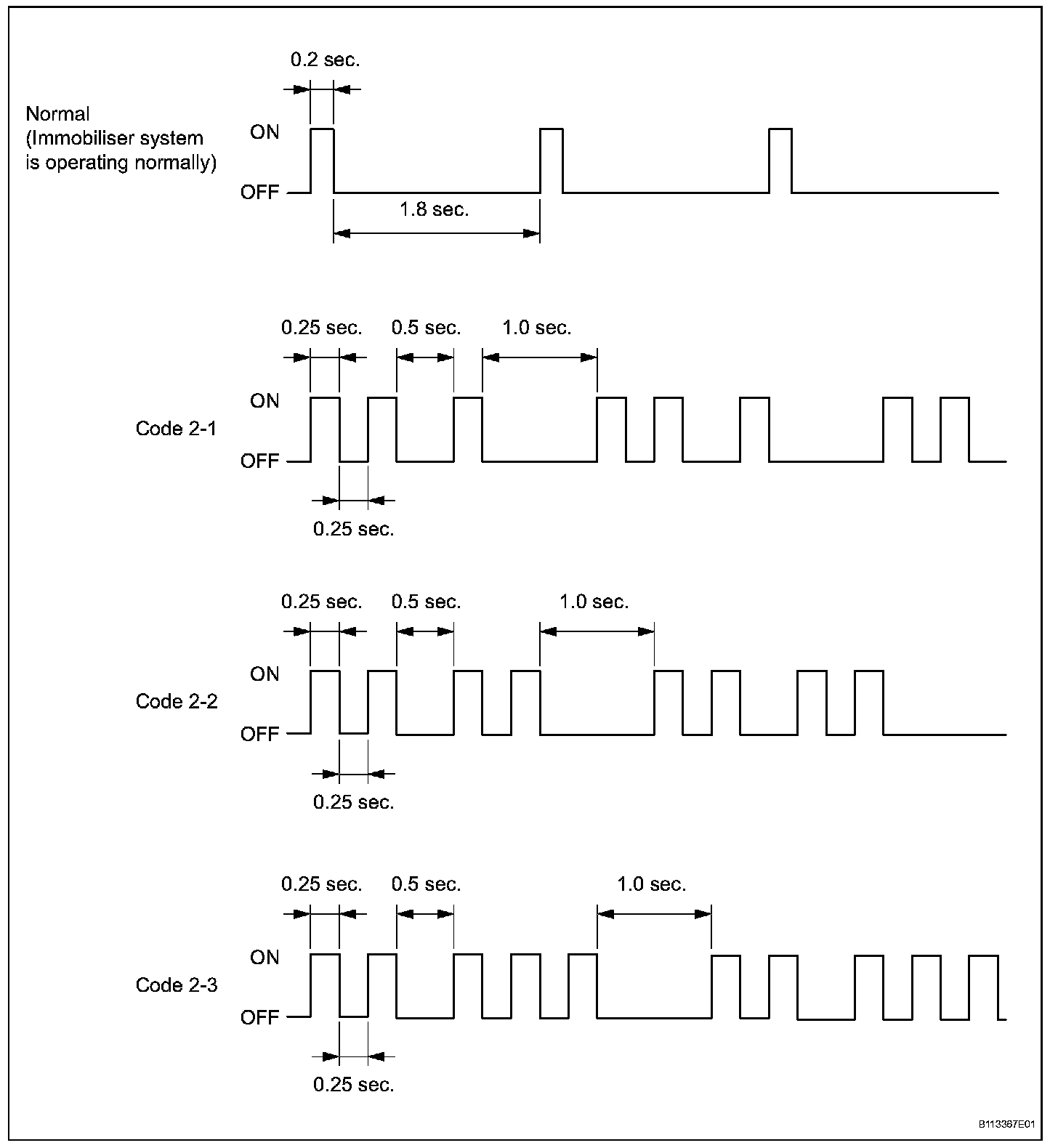 - If the key code registration has failed in automatic key code registration mode, code 2-1 will be output from the security indicator light. Trying to reregister an already registered key will cause code 2-2 to be output when the key is inserted. If the number of registered key codes exceeds the limit, code 2-3 will be output from the security indicator light. The output details are shown.