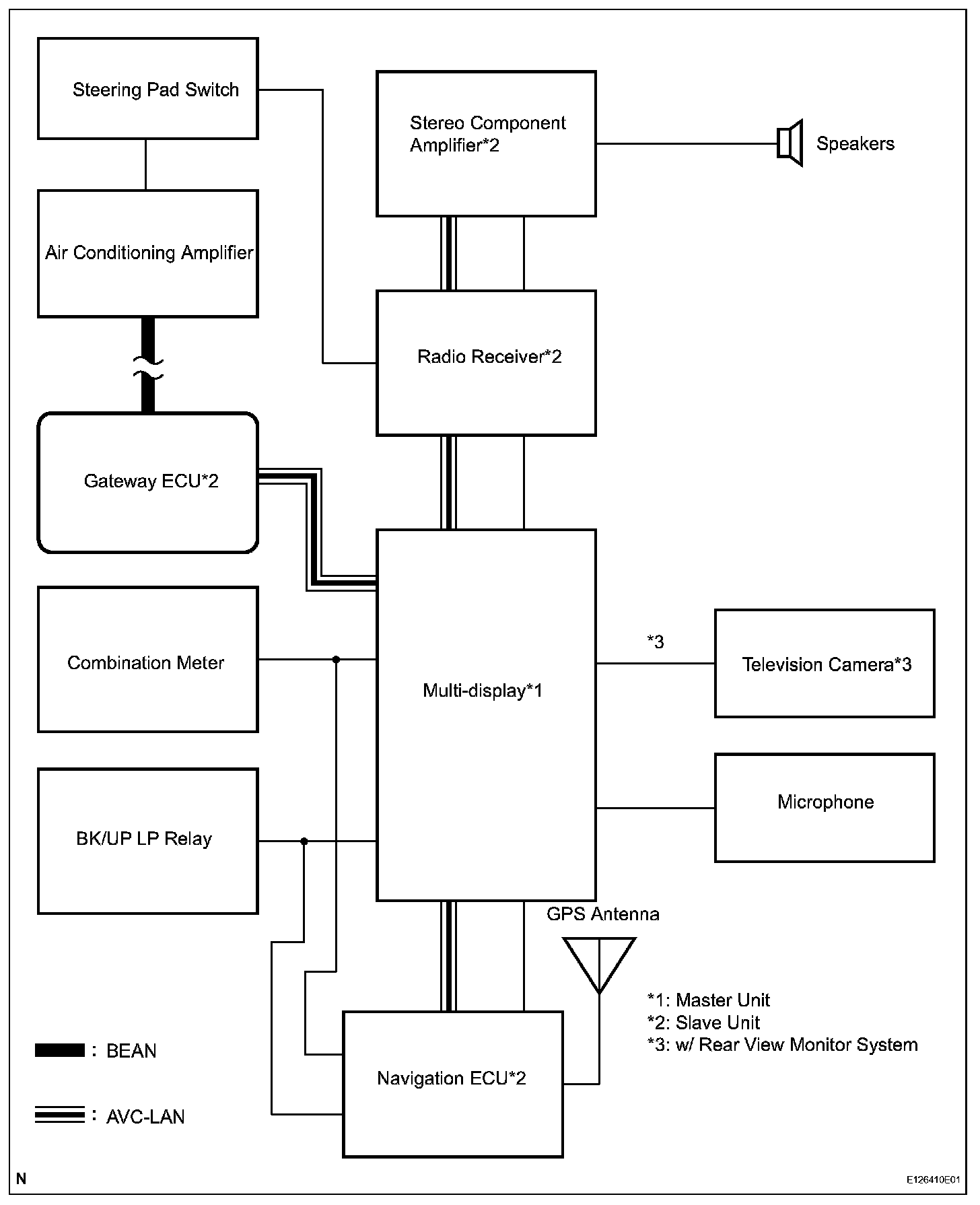 If the navigation system is not equipped, the audio head unit acts as the master unit instead. If the multi-display is equipped, it is the navigation ECU master unit.