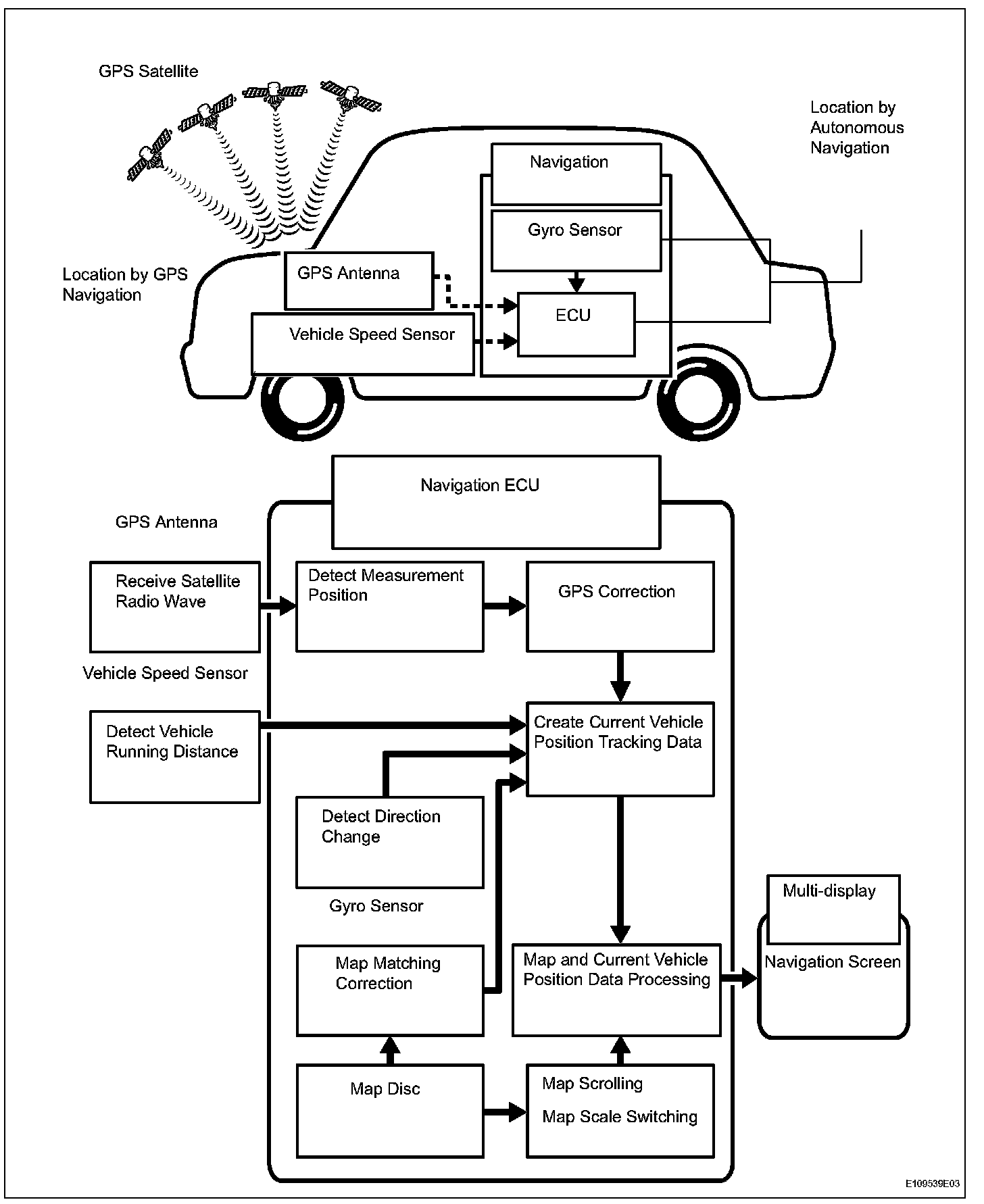 1. It is essential that the navigation system correctly tracks the current vehicle position and displays it on the map. There are 2 methods to track the current vehicle position: autonomous (dead reckoning) and GPS* (satellite) navigation. Both navigation methods are used in conjunction with each other.