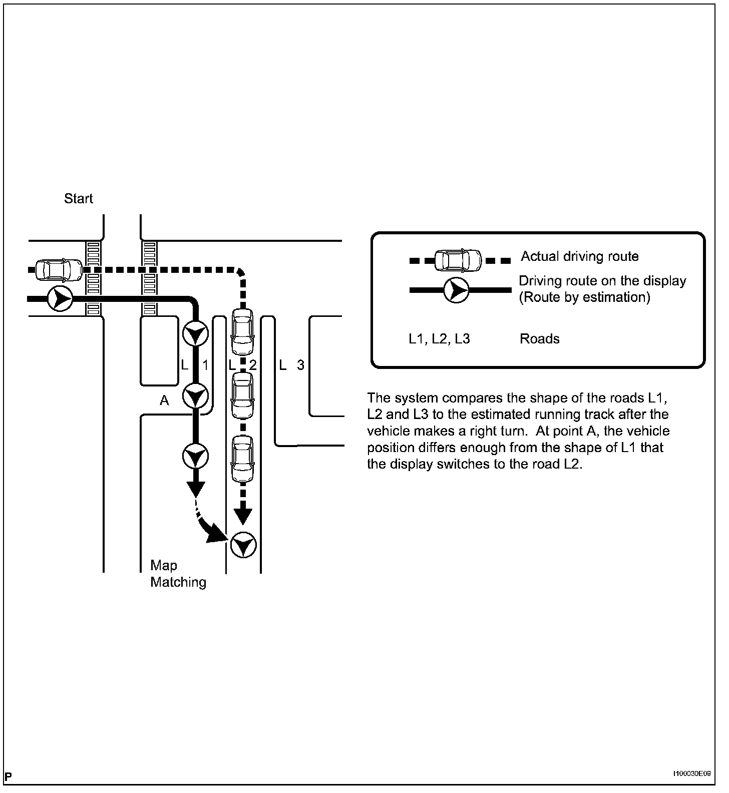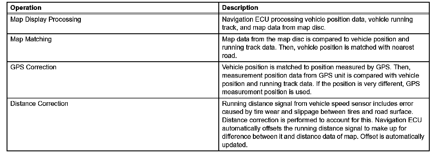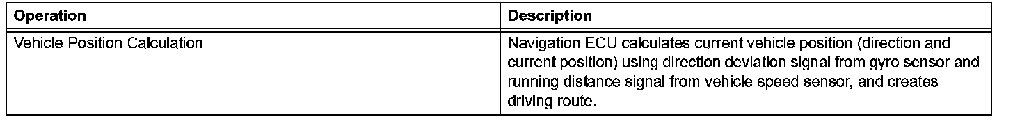 The current driving route is calculated by autonomous navigation (according to the gyro sensor and vehicle speed sensor) and GPS navigation. This information is then compared with possible road shapes from the map data in the map disc and the vehicle position is set onto the most appropriate road.