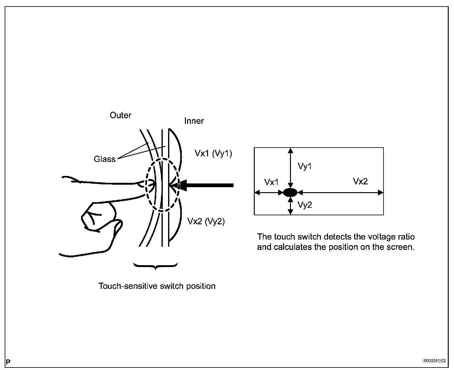 Touch switches are touch-sensitive (interactive) switches operated by touching the screen. When a switch is pressed, the outer glass bends in to contact the inner glass at the pressed position. By doing this, the voltage ratio is measured and the pressed position is detected.