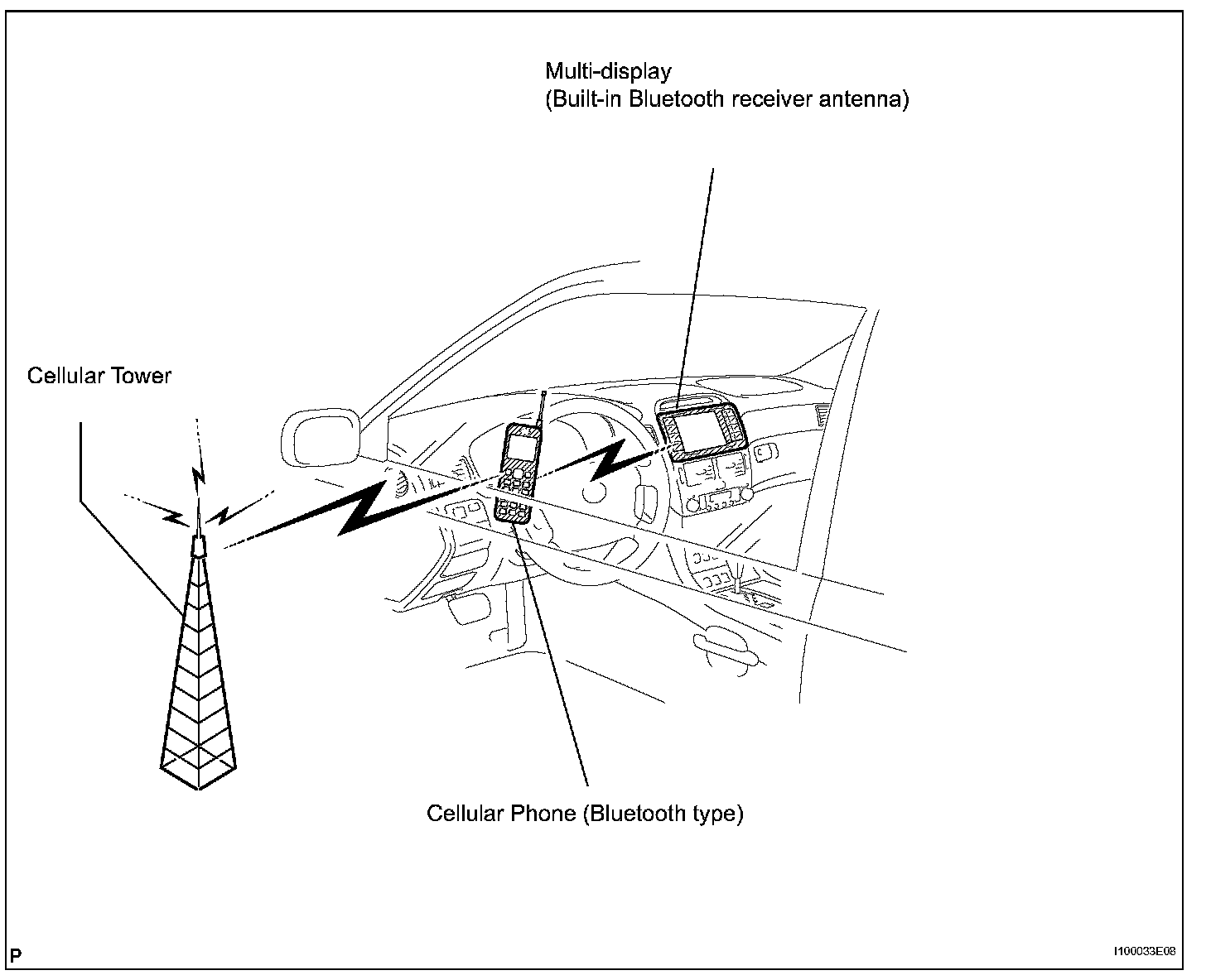 a. Bluetooth is a new wireless connection technology that uses the 2.4 GHz frequency band. This makes it possible to connect a cellular phone (Bluetooth capable phone*) to the multi-display (Bluetooth system is built-in), and use a handsfree function with the cellular phone in a pocket or bag. As a result, it is not necessary to use a connector for the cellular phone.