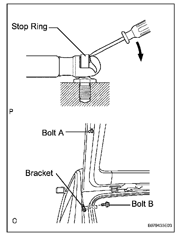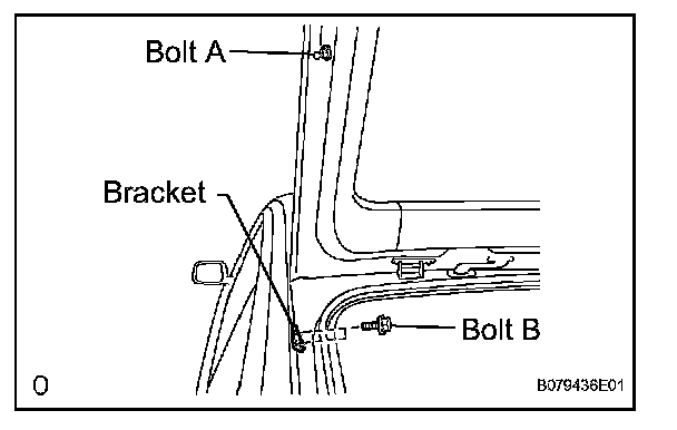 c. Remove the 2 bolts labeled B and stay bracket from the body panel.