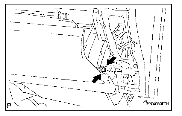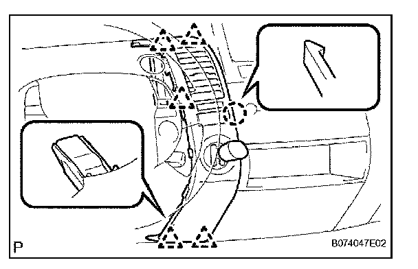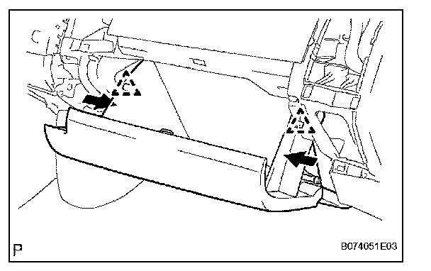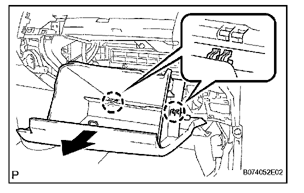 a. While pushing in the sides of the glove compartment door as indicated by the arrows in the illustration, open the door to release it from the 2 stoppers.