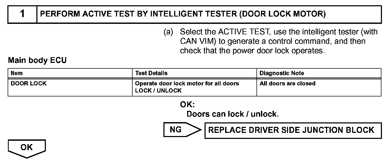 The main body ECU in the driver side junction block receives lock / unlock switch signals and activates the door lock motor according to the signals.