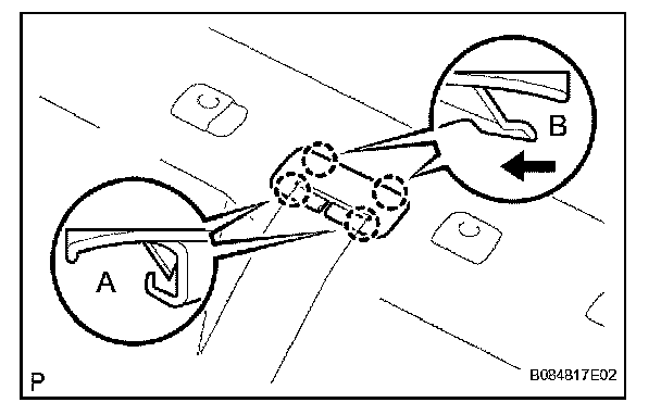 b. Pull the shoulder belt cover in the direction indicated by the arrow in the illustration to detach the 2 claws labeled B. Then remove the shoulder belt cover.