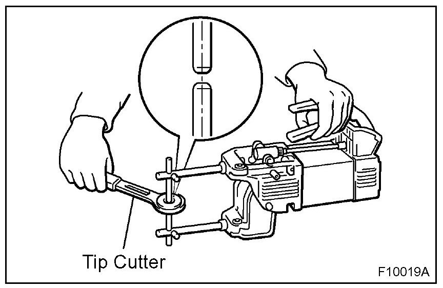 1. When welding panels with a combined thickness of over 3 mm (0.12in.), use a MIG (Metal Inert Gas) welder for plug welding.