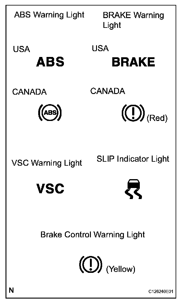 - If the indicator check result is not normal, proceed to troubleshooting for the ABS warning light circuit, VSC warning light circuit, BRAKE warning light circuit, Brake Control warning light circuit or SLIP indicator light circuit.