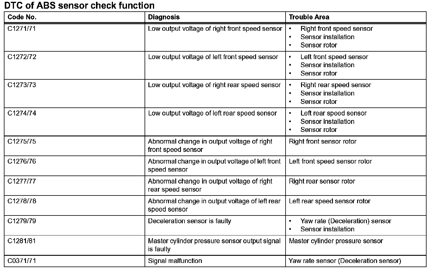 - Before the speed sensor check, the yaw rate sensor, deceleration sensor and master cylinder pressure sensor checks should be completed.