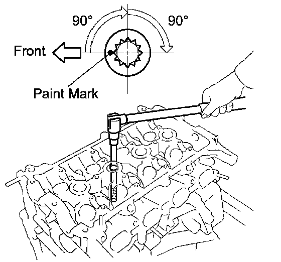 e. Retighten the cylinder head bolts by an additional 90° and then another 90°, as shown in the illustration.