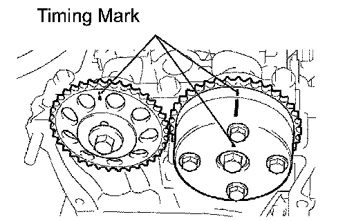 b. Place the camshaft and No. 2 camshaft on the cylinder head with the timing mark on the camshaft timing gear facing upward.