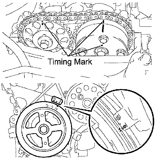 1. Turn the crankshaft pulley until its timing notch and timing mark 0 of the chain cover are aligned.