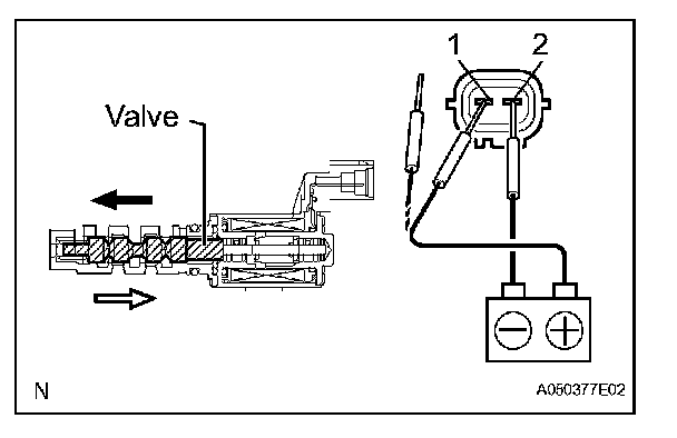 1. Connect the battery positive (+) lead to terminal 1 and negative (-) lead to terminal 2, and inspect the movement of the valve.