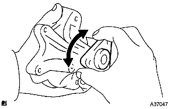 b. Turn the pulley, then check that the water pump bearing moves smoothly without making a noise.