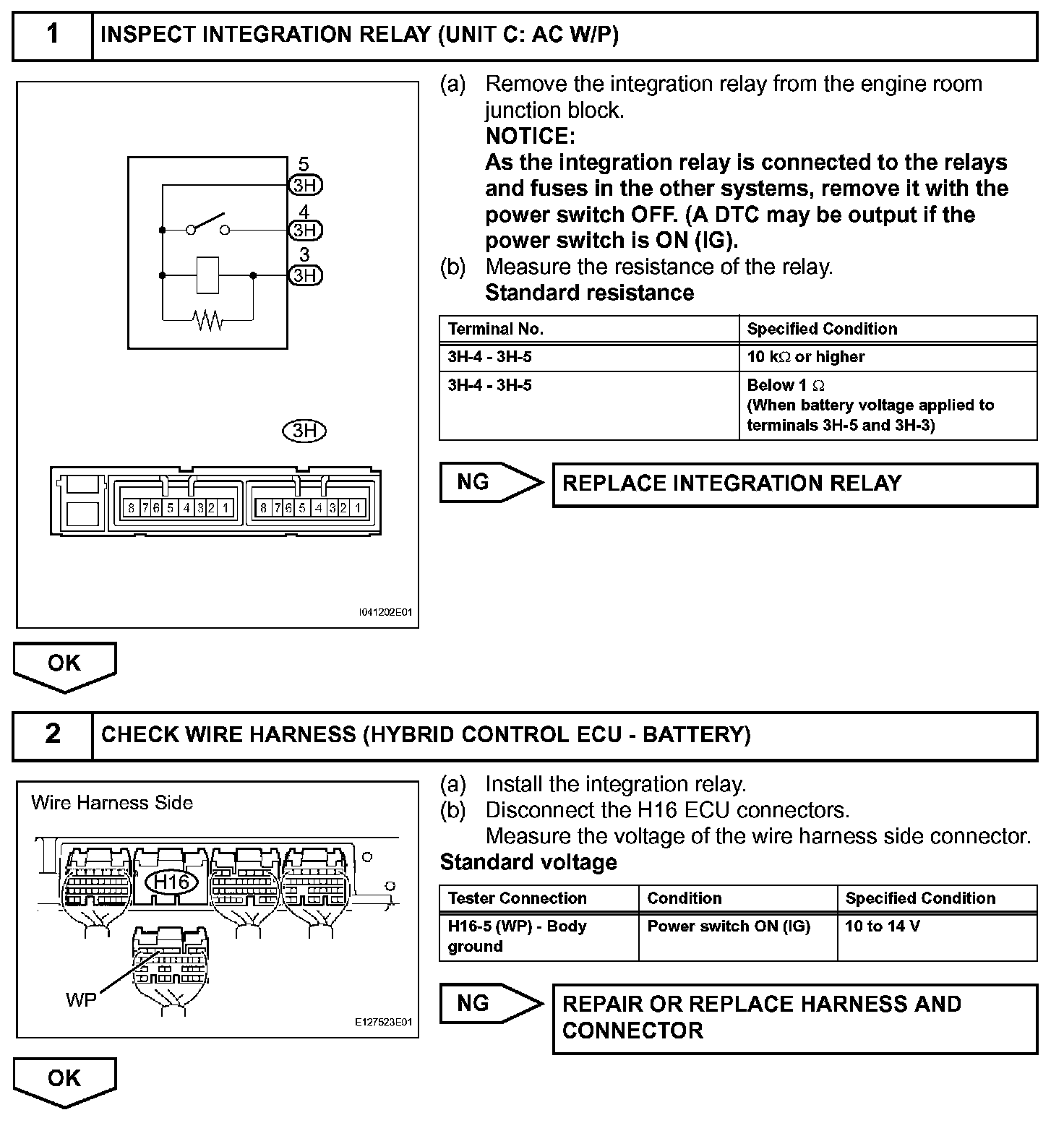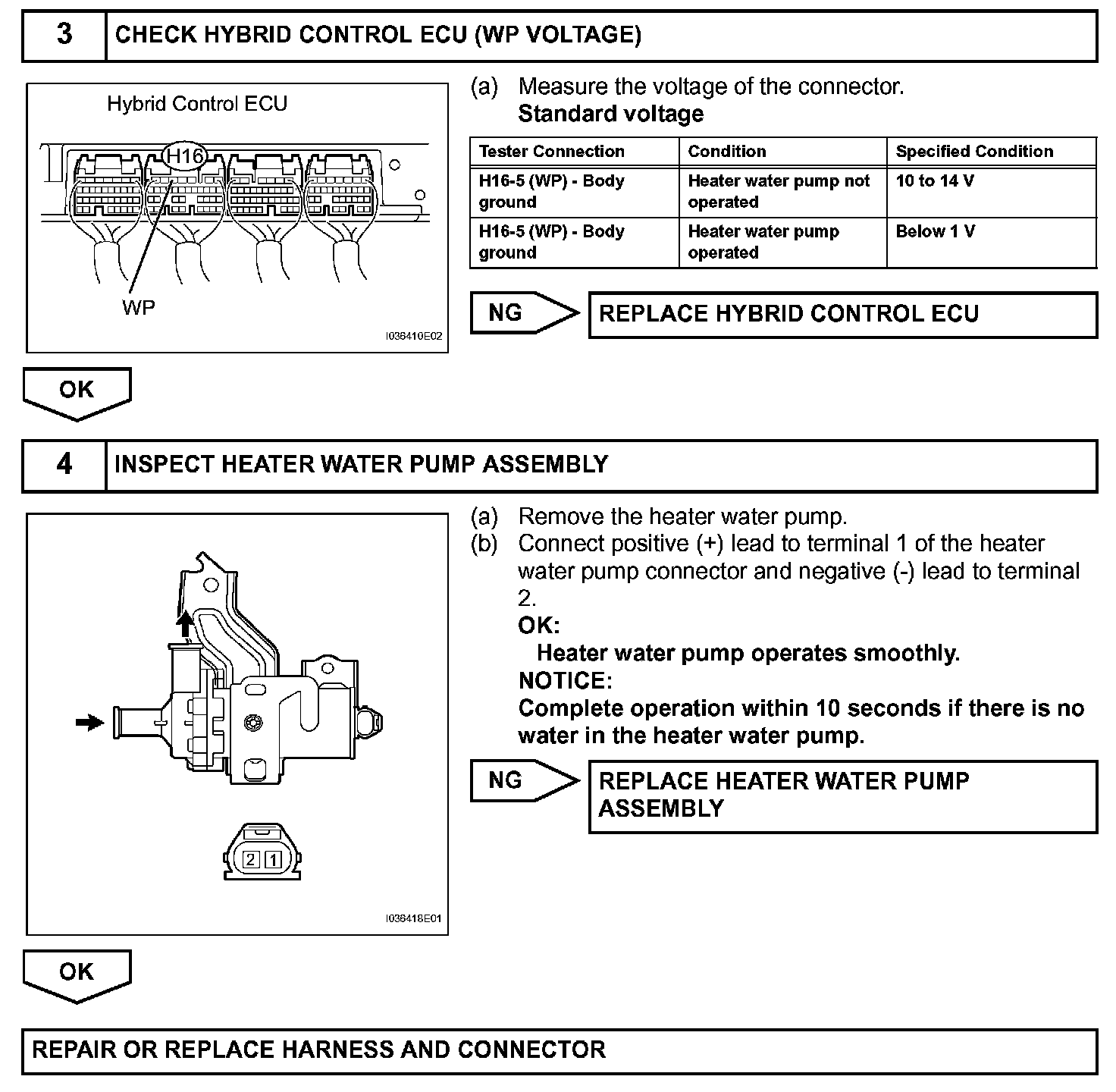 Directed by the air conditioning amplifier, hybrid control ECU operates the water pump relay and drives the heater water pump.
