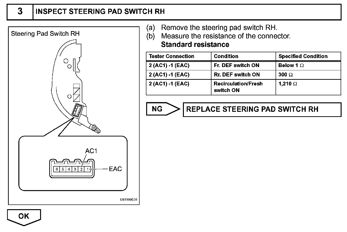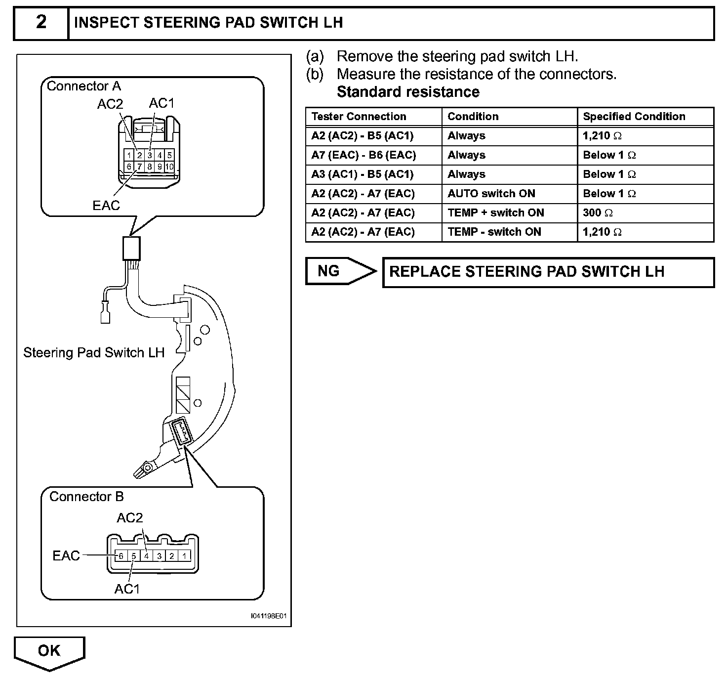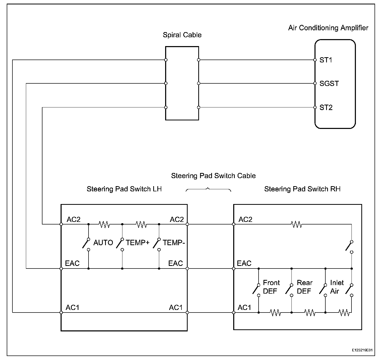 The resistance of the steering pad switch changes in accordance with switch operation. The air conditioning amplifier outputs voltage to the steering pad switch and reads voltage changes according to the resistance changes with switch operation.
