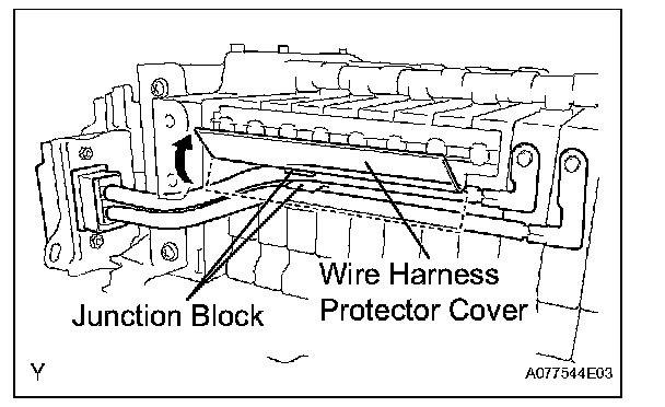 c. Open the wire harness protector cover as shown in the illustration. Then remove the service plug from the junction block.