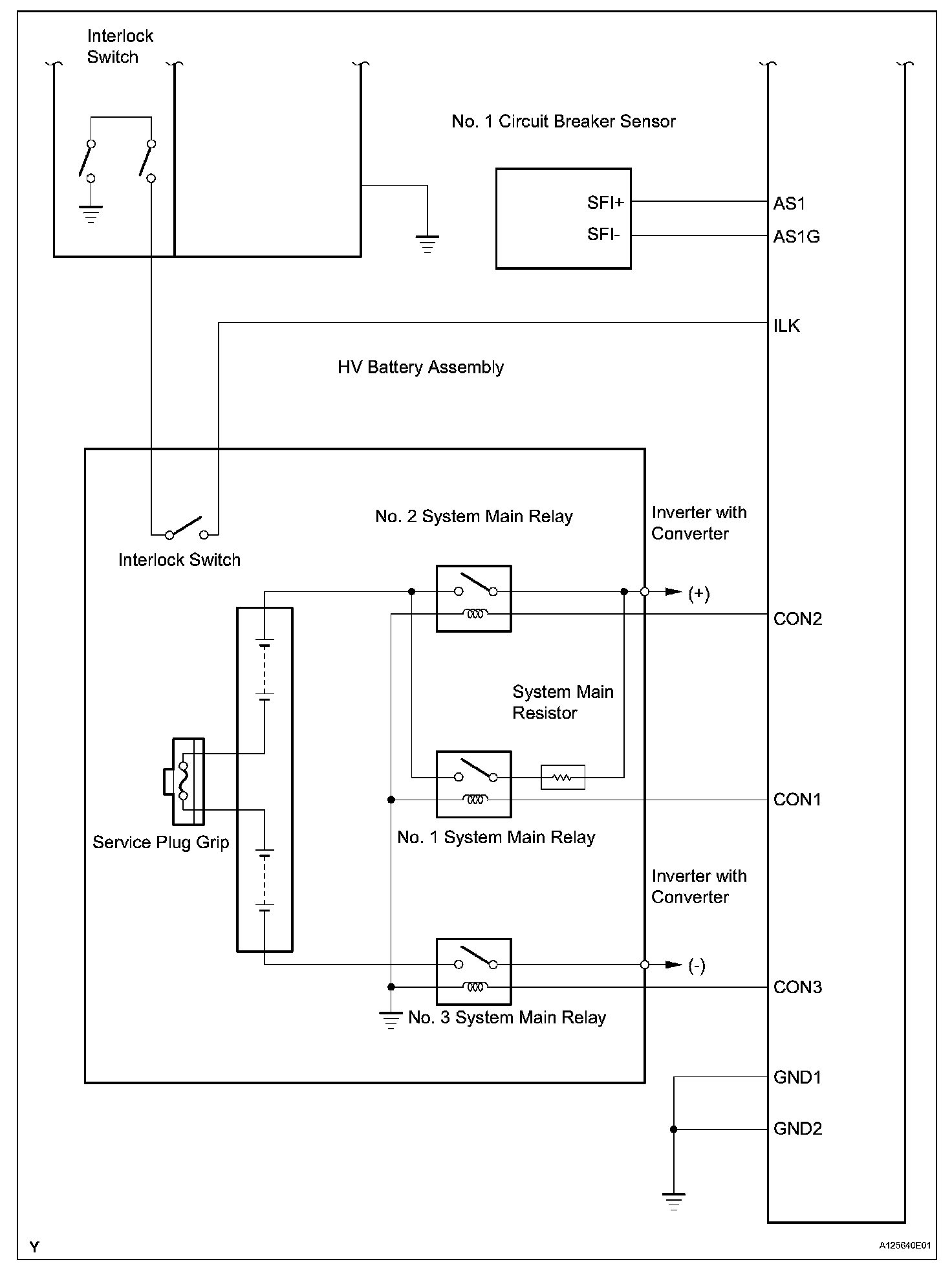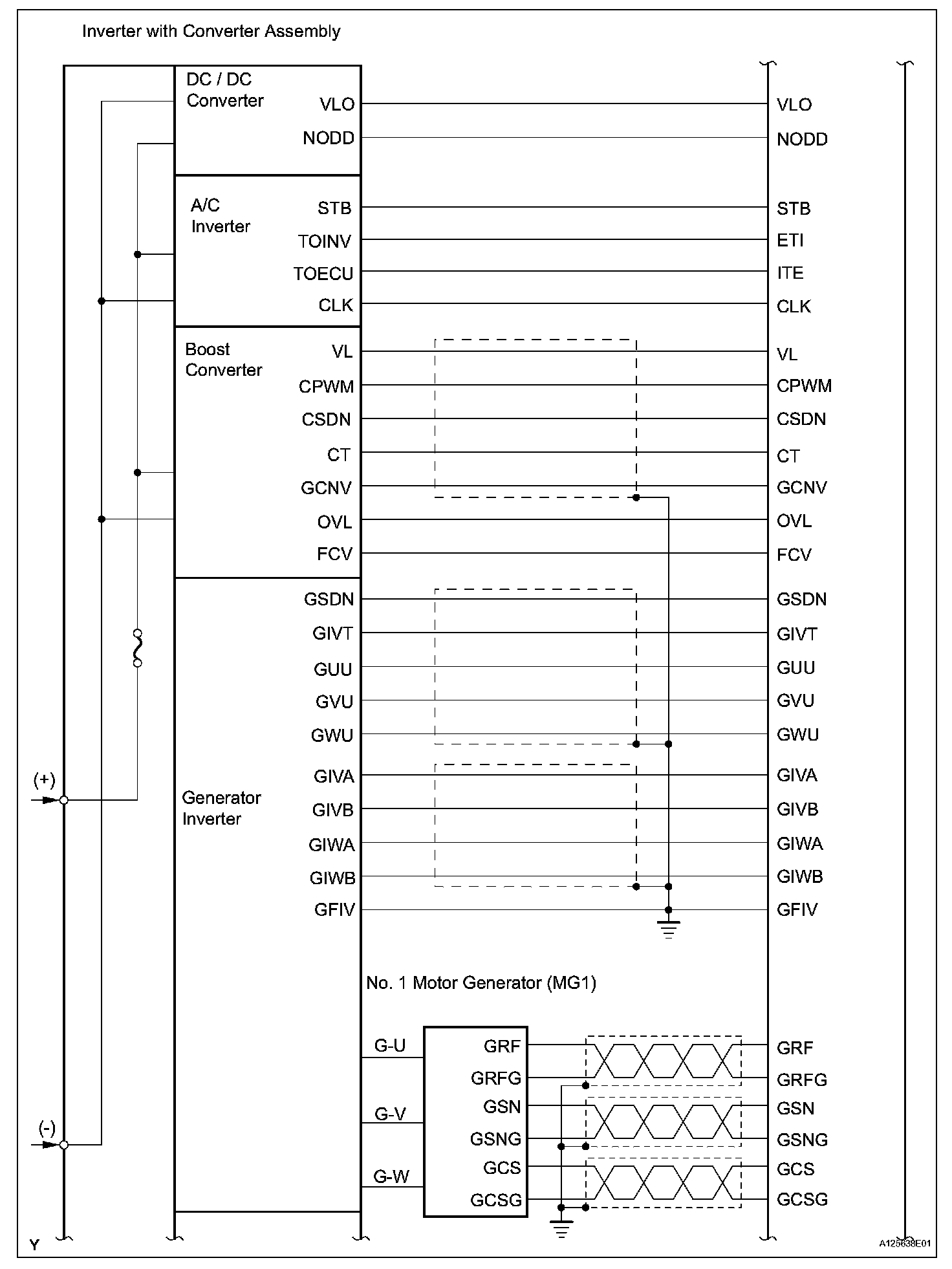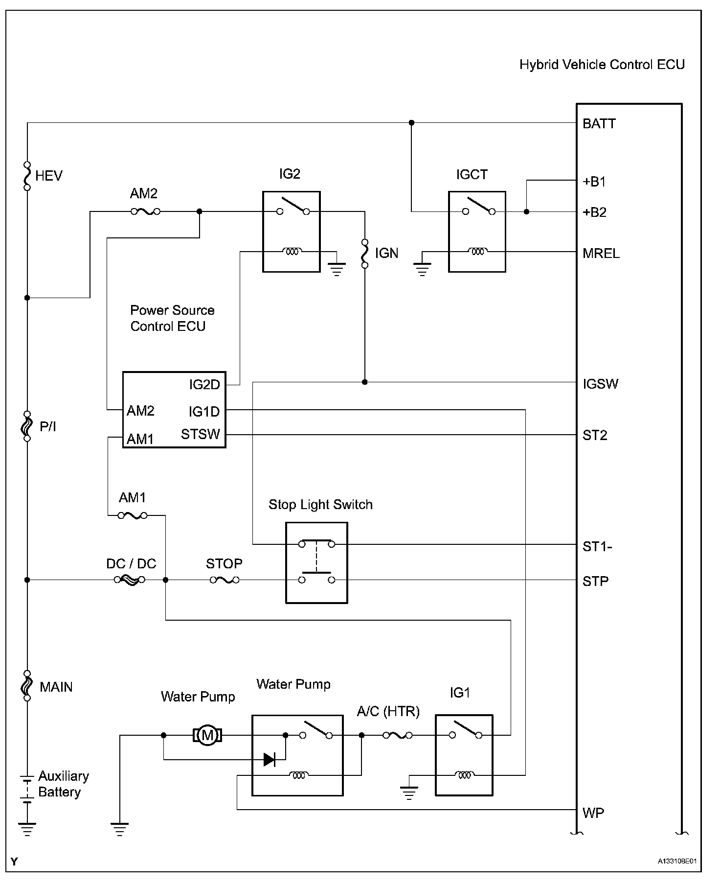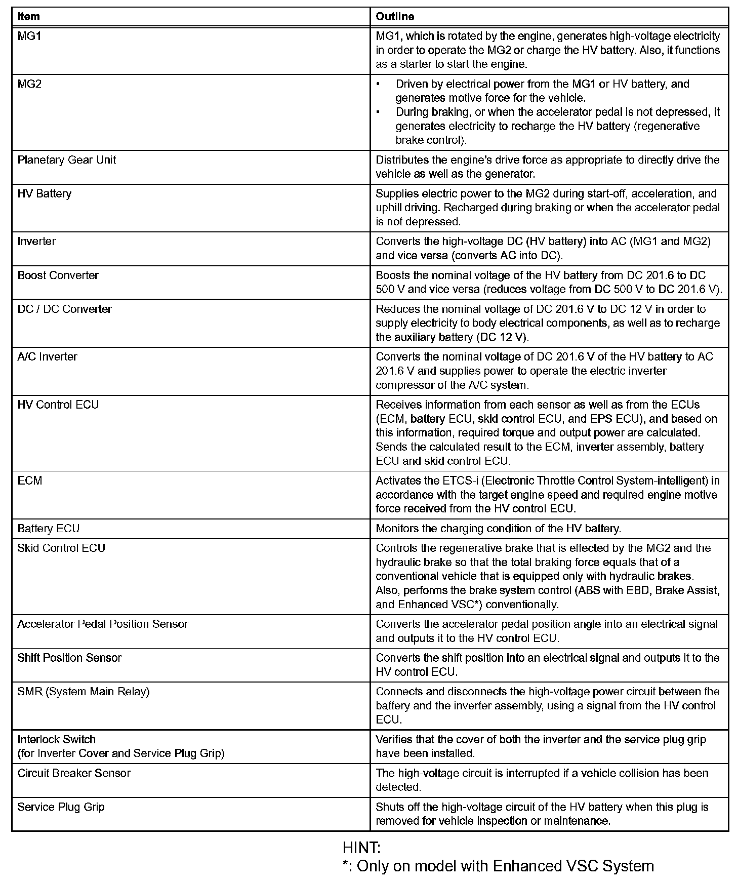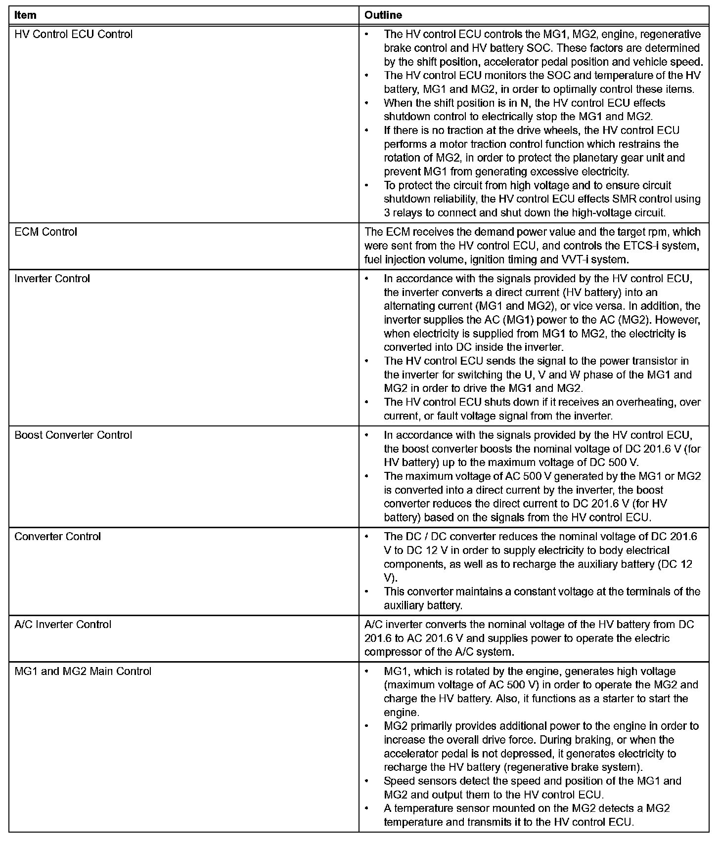 b. The HV control ECU switches between these modes ((1), (2), (3), (1) + (2) + (3), or (4)) according to the driving condition. However, when the SOC (State of Charge) of the HV battery is low, the HV battery is charged by the engine by turning MG1.