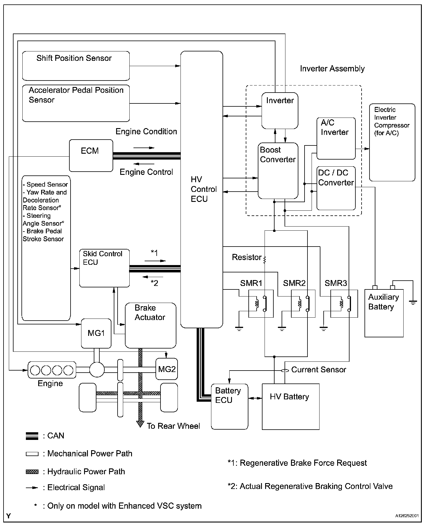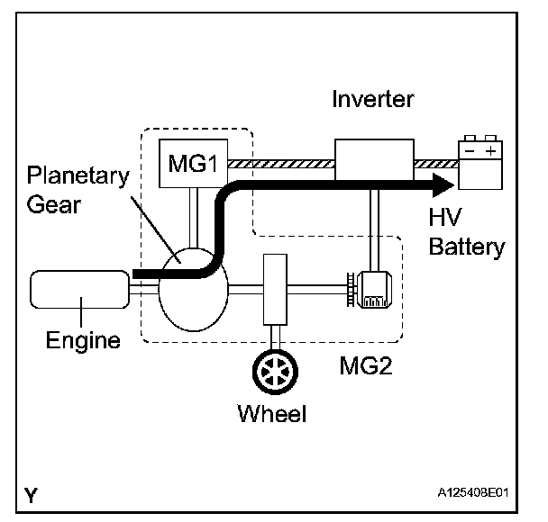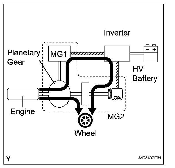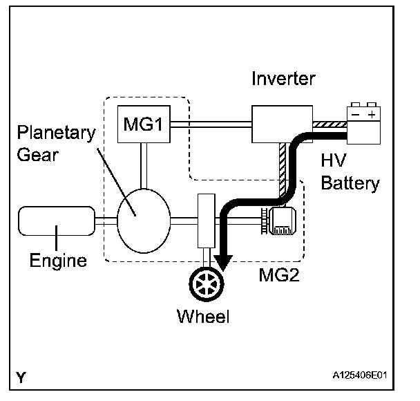 1. Supply of electrical power from the HV battery to MG2 provides force to drive the wheels.
