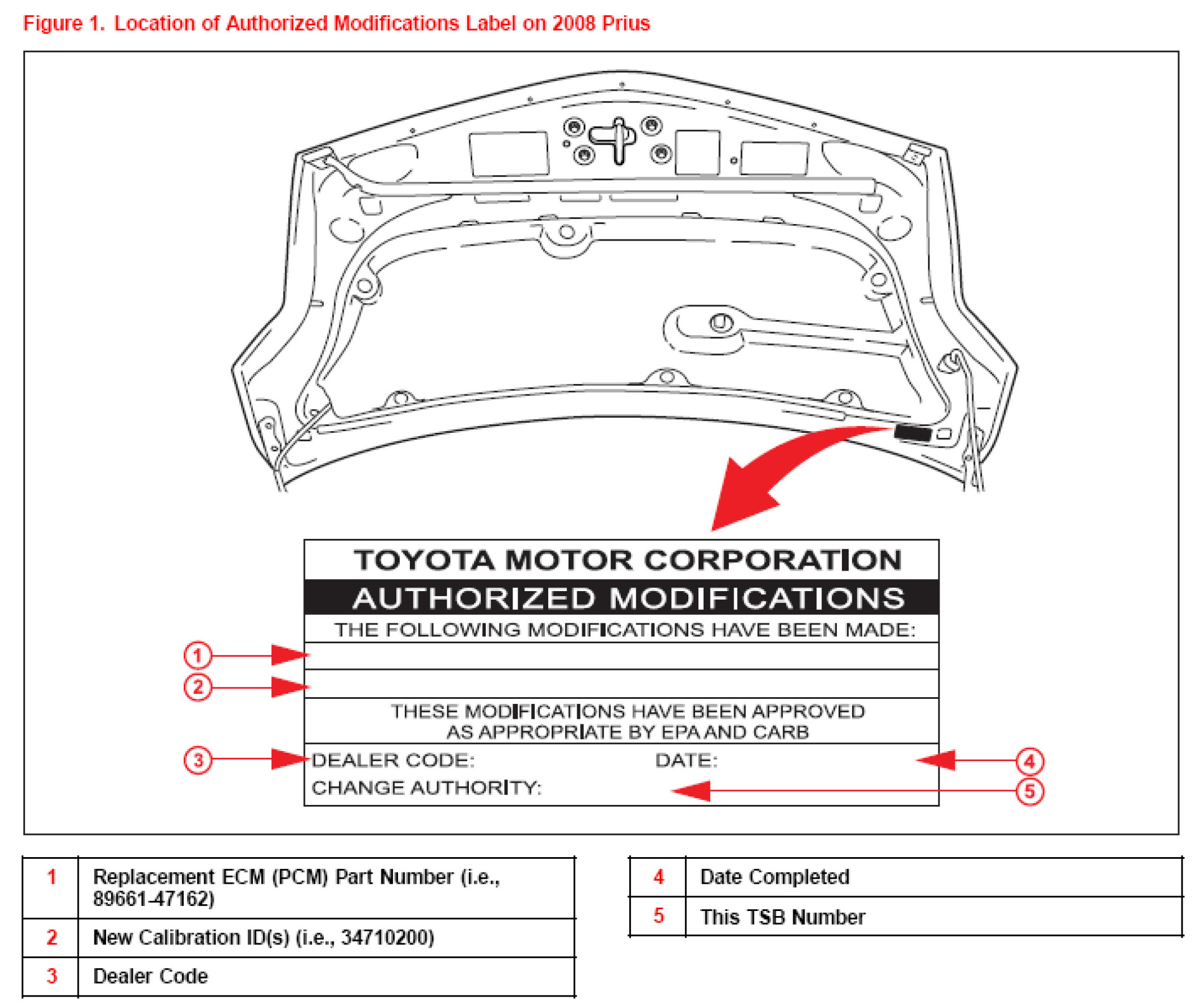 1. Check for the Authorized Modifications Label affixed to the vehicle in the location shown in Figure 1. Confirm if the ECM (PCM) calibration has been updated. If the calibration ID listed is NOT the latest ECM (PCM) calibration - go to step 2.