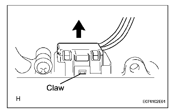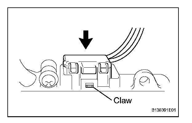c. Attach the claw and disconnect the connector, and then install the headlight light control ECU.