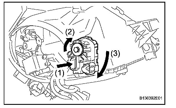 c. Rotate the headlight leveling motor in the direction indicated by arrow (3) in the illustration to install it.