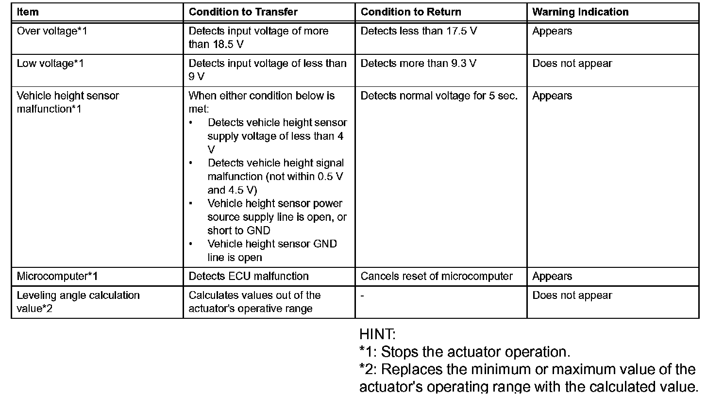 a. If the headlight beam level control ECU detects the following malfunctions, it performs the fail safe control, blinks the master warning light in the combination meter, and displays "AUTO LEVELING WARNING" on the multi-display.