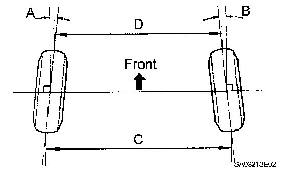 - If the toe-in is not within the specified range, inspect the suspension parts for damage and/or wear, and replace them if necessary.