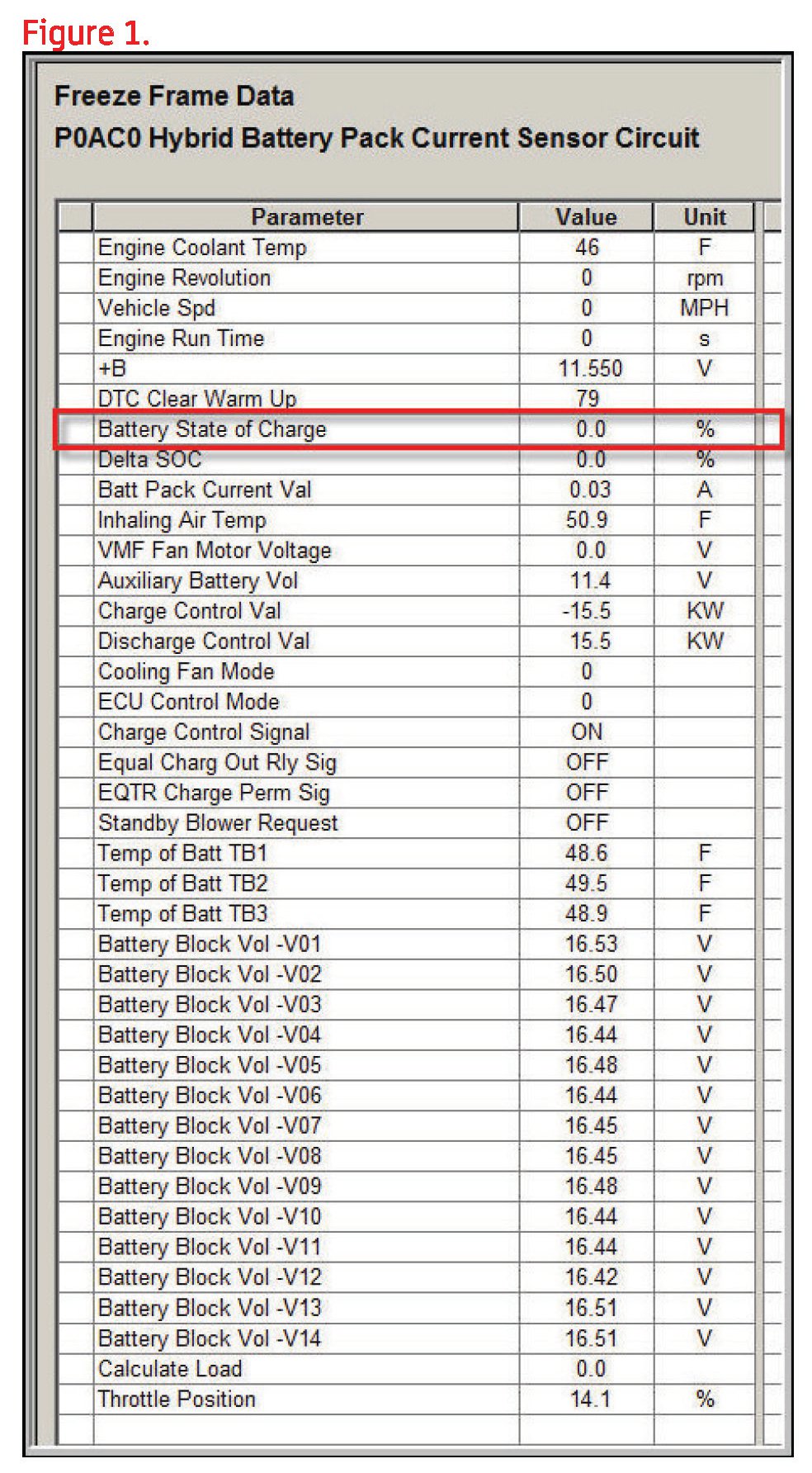 Inspect the Battery State of Charge (Figure 1) and Battery Block Voltages 1-14 (Figure 2).