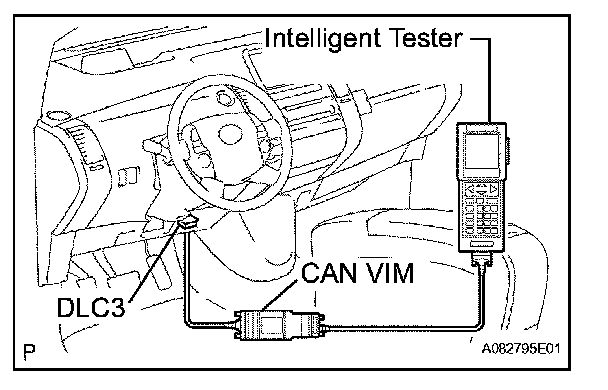 To check the DTCs, connect the intelligent tester to the DLC3. The tester displays DTCs, freeze frame data, and a variety of engine data.The DTCs and freeze frame data can be erased with the tester. In order to enhance OBD function on vehicles and develop the Off-Board diagnosis system, the Controller Area Network (CAN) communication is used in this system. It minimizes the gap between technician skills and vehicle technology. CAN is a network which uses a pair of data transmission lines that span multiple ECUs and sensors. It allows high speed communication between the systems and simplifies the wire harness connections. The CAN Vehicle Interface Module (CAN VIM) must be connected with the intelligent tester to display any information from the ECM. The intelligent tester and ECM uses CAN communication signals to communicate. Connect the CAN VIM between the intelligent tester and DLC3.