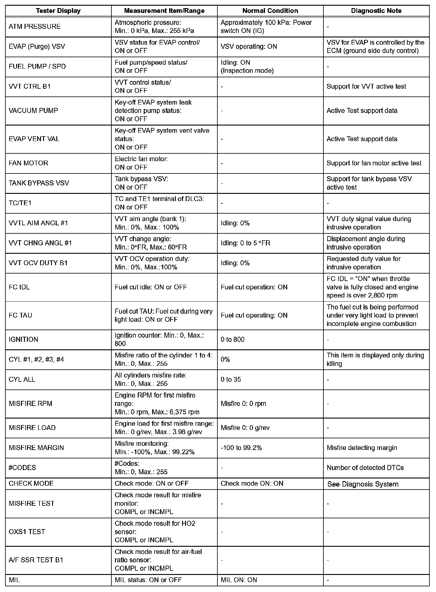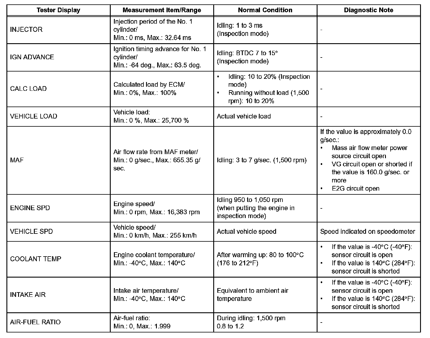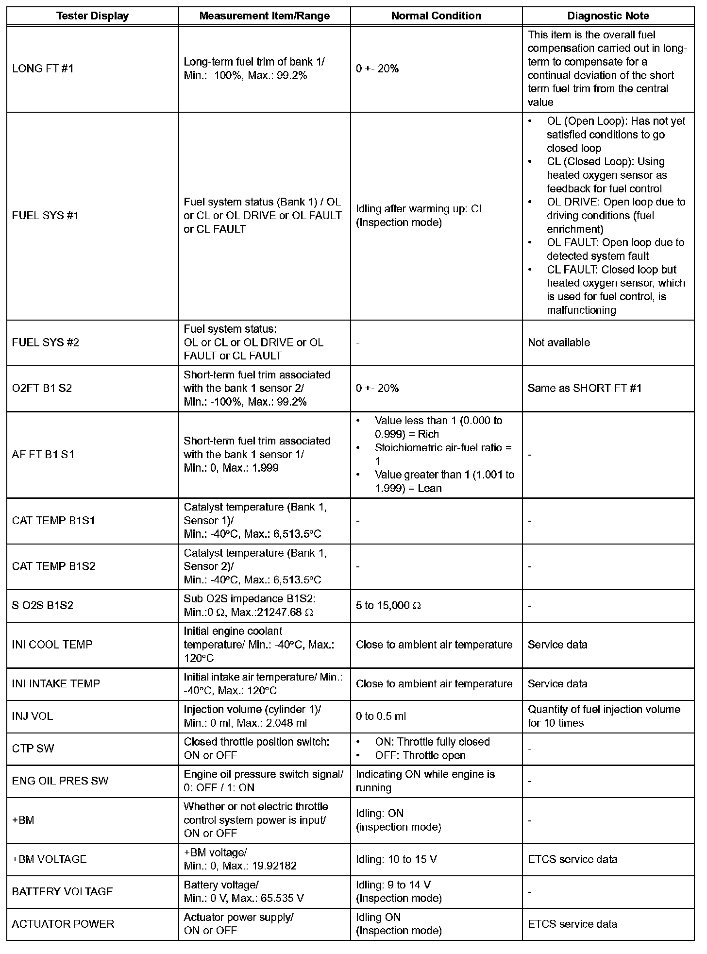 DATA LISTHINT: Using the intelligent tester DATA LIST allows switch, sensor, actuator and other item values to be read without removing any parts. Reading DATA LIST early in troubleshooting is one way to shorten labor time.