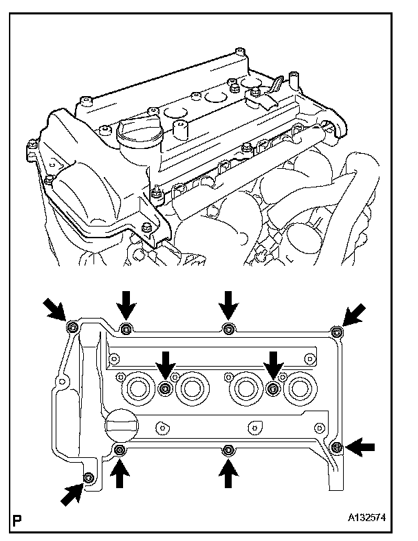 h. Remove the 9 bolts, 2 seal washers, 2 nuts and cylinder head cover.