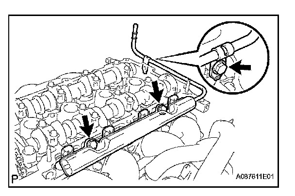 c. Install the fuel delivery pipe together with the 4 fuel injectors, and then temporarily tighten the 3 bolts.