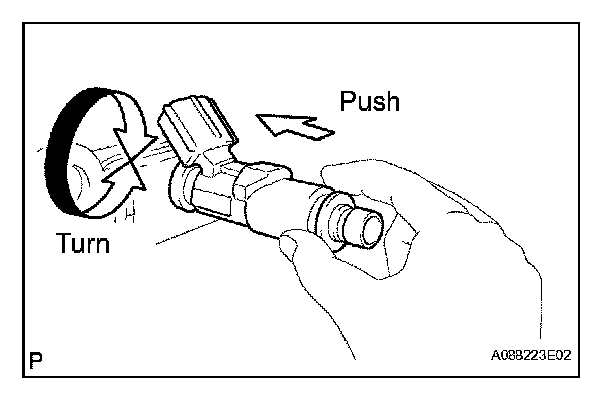 c. Apply a light coat of spindle oil or gasoline to the Oring again, and install the fuel injector by turning it right and left while pushing it onto the fuel delivery pipe.