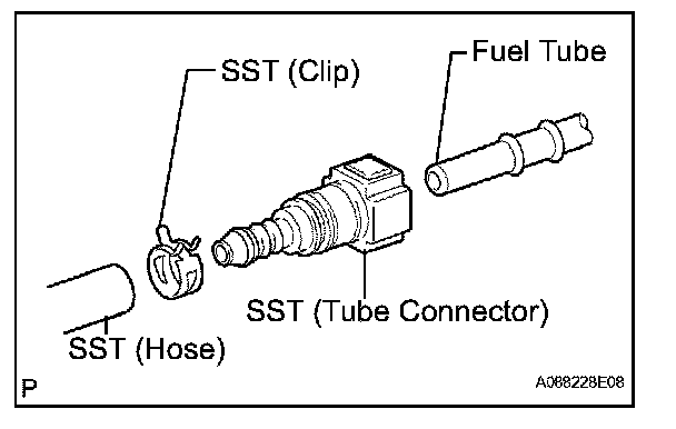 1. Connect SST (fuel tube connector) to SST (hose) then connect them to the fuel tube (the vehicle side).
