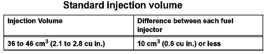 NOTE: Always turn the voltage on and off on the battery side, not the fuel injector side. If the injection volume is not as specified, replace the fuel injector assembly.