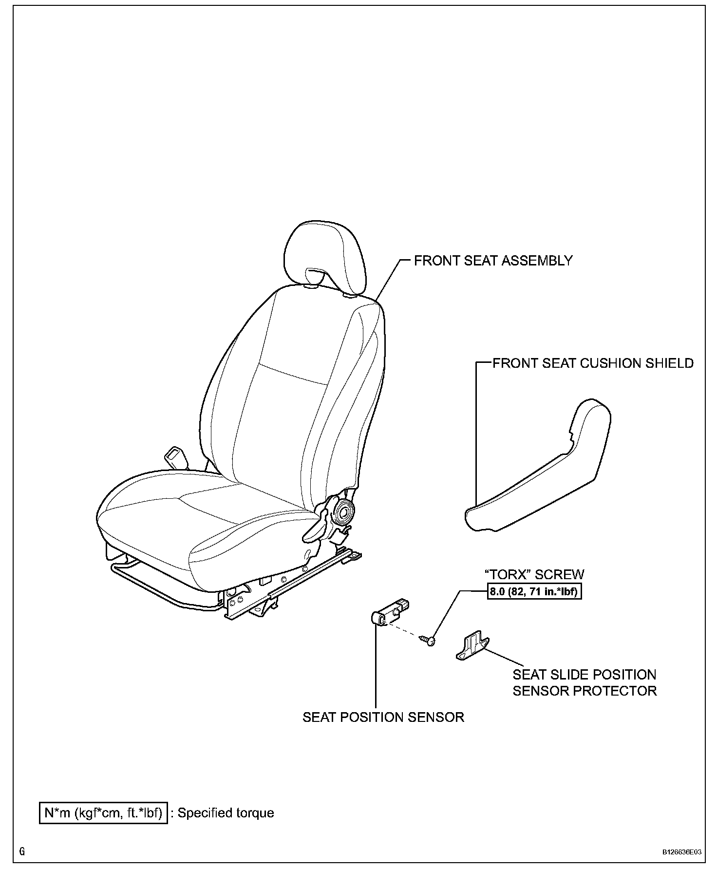 d. Using a "torx" socket wrench (T30), tighten the "torx" screw to install the seat position sensor.