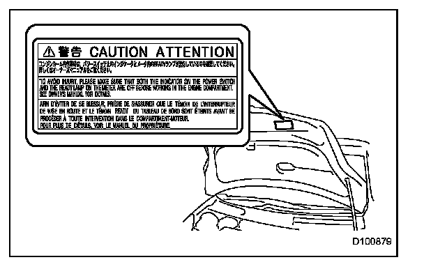 PRECAUTIONS TO BE OBSERVED WHEN INSPECTING OR SERVICING ENGINE COMPARTMENTThe PRIUS automatically turns the engine ON and OFF when the READY light on the instrument panel is ON. To avoid injury, remove the key from the key slot before inspecting or servicing the engine compartment.